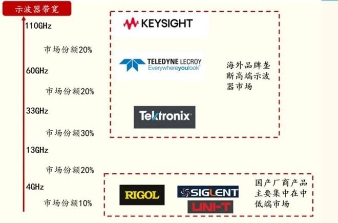 尽管普源精电在2023年推出了13GHz示波器;鼎阳科技在2025年推出了16GHz示波器,标志着国产厂商已开始涉足10GHz以上的市场,但与国际巨头相比,无论在最高带宽指标还是市场份额上,差距依然悬殊。