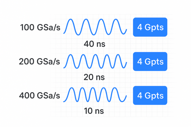 尽管如此,其仍需高采样率才能发挥潜力。如果采样率低,存储深度再大也是“浪费”(点数少,细节粗糙)。基于此,虽然万里眼的200GSa/s够用,但业内推荐225-450 GSa/s(2.5-5倍带宽)才能最大化4Gpts潜力(如更精细的重建波形)。否则,在极高频场景下,捕获时间虽长,但分辨率(如抖动测量误差)可能仍达3%-5%,无法全面领先国际产品(如是德科技的256GSa/s+可升级存储)。
