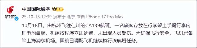 国航后续给出的说明显示,这次火情的源头是一名旅客手提行李中的锂电池自燃,而这份行李被违规存放在了头顶行李架中——按照民航规定,锂电池类物品必须由乘客随身携带,放在能随时观察的位置,一旦出现异常才能及时发现并处理。