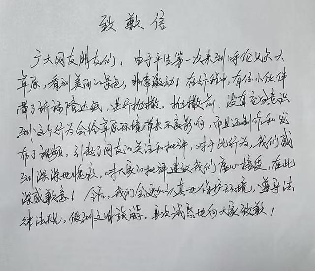 这封手写的致歉信称,由于平生第一次来到呼伦贝尔大草原,看到美丽的景色非常激动:“在行程中,有位小伙伴带了祈福隆达纸进行抛撒,抛撒前没有充分意识到这个行为会给草原环境带来不良影响,而且还制作和发布了视频,引起网友的关注和批评。”