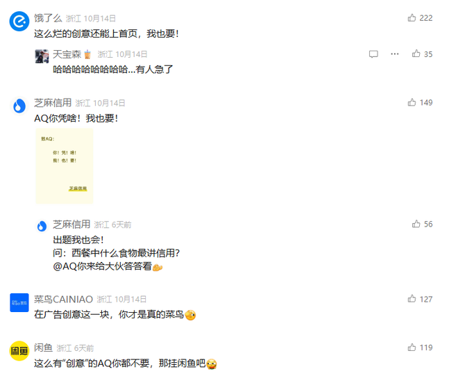 比如菜鸟吐槽称“在广告创意这一块,你才是真的菜鸟”,饿了么发布评论“这么烂的创意都可以上首页,我也要”,闲鱼表示“这么有‘创意’的AQ你都不要,那挂闲鱼吧”......