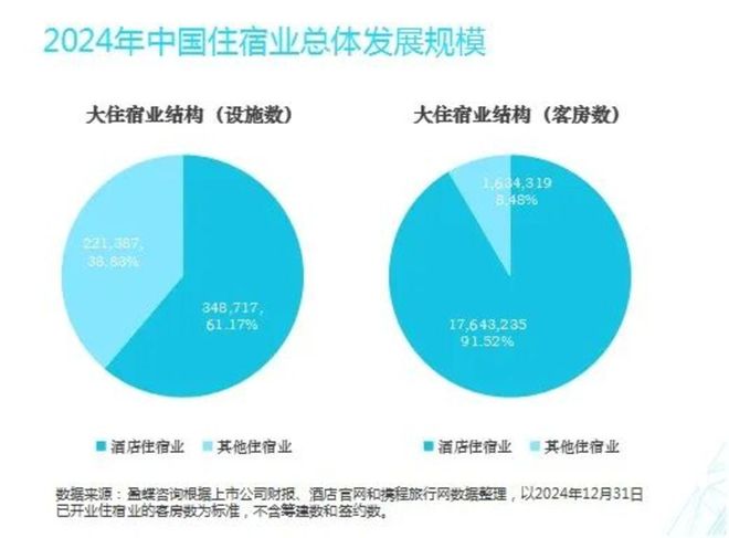 截至2024年末,全国住宿业设施达57.01万家,客房规模超1927万间,其中酒店业以34.87万家设施、1764万间客房占据绝对主导,分别贡献61.17%的设施量和91.52%的客房量。