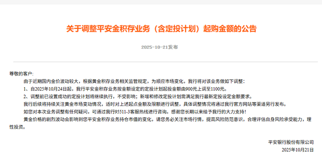 具体看来,平安银行自10月24日起将定投计划的起投金额由900元提高至1100元。