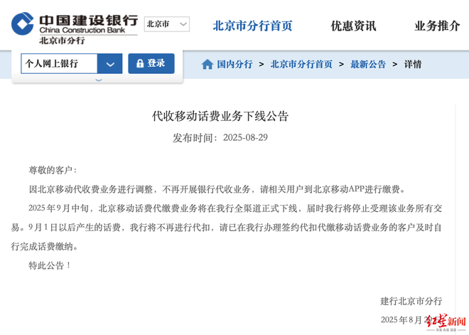 中国建设银行北京市分行《代收移动话费业务下线公告》 图源:中国建设银行官网