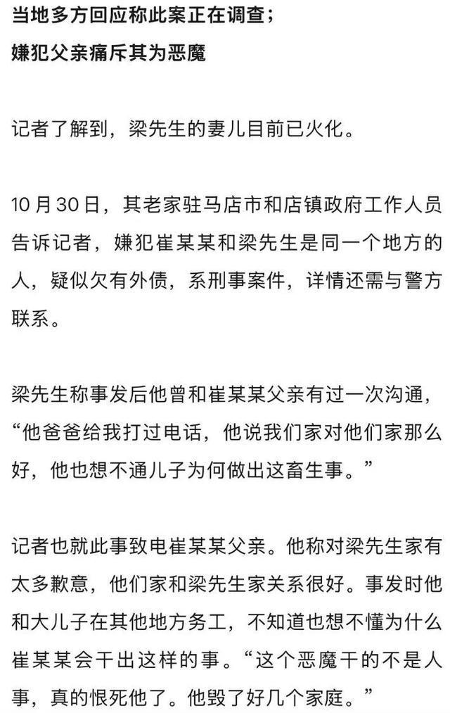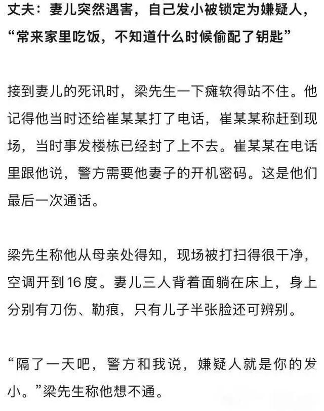 梁先生托发小崔某某去家里看看,发小以有事推托。梁先生只好托母亲和岳父岳母。终于盼到的消息,却是30岁妻子、8岁半儿子、7岁女儿的死讯。