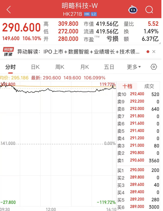 今日明略科技股价高开高走,截至收盘,报290.60港元/股,上涨106%,总市值达419.56亿港元。