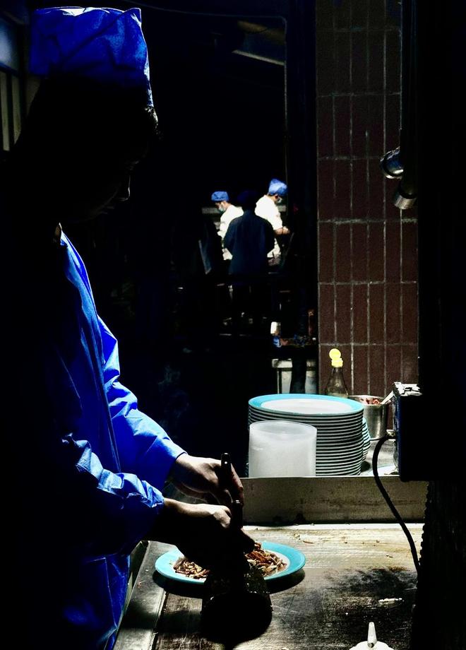 我拍照片时喜欢拉开反差,让它有一种二维的感觉。这张照片(上图)是在我们学校食堂里拍的,我看到了一位正在做中餐的厨师正在摆弄眼前的餐碟,但视线过去,有两个身着白色衣服的厨师在工作,他们还被一个厨师的影子区分开来,我能感觉到这样的视觉,拍下了这个时刻。