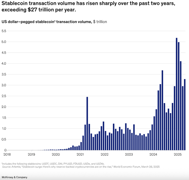 麦肯锡在2025年报告《TheStableDoorOpens》中指出:“到2030年,稳定币与代币化现金将成为全球支付网络的核心通道之一。”传统Visa/Mastercard的商业逻辑——“清算、对账、信任”,正被链上可验证系统重写。