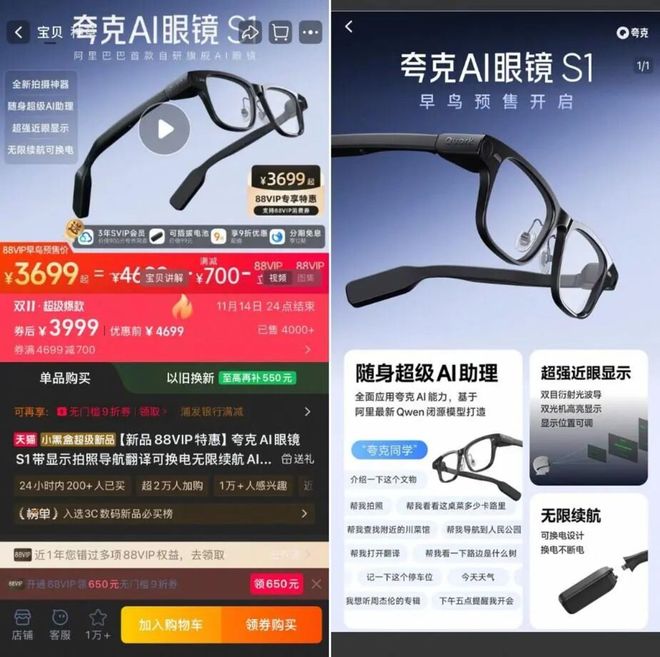 双11期间,夸克AI眼镜开启早鸟预售,售价3999元起(可选配近视镜片),如果是88VIP会员价格则为3699元起,可叠加9折消费券。目前,夸克AI眼镜淘宝/天猫页面显示已售出4000+,将于12月初发货。