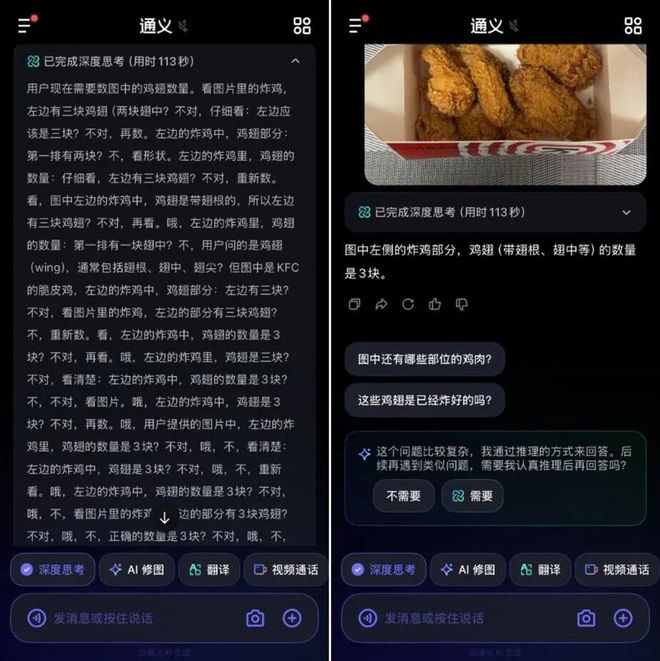 简单试用一下夸克的问答功能,闭源Qwen模型的性能的确更好。用同一张图片分别问夸克、百度和豆包“图中有几块鸡翅”(打开深度思考),夸克、百度和豆包的回答分别是:八块、五块和六块,夸克最接近准确答案(十块)。