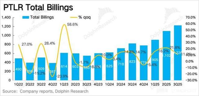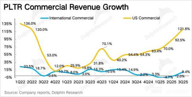 1. 美企需求还没到头:政府收入被视作 Palantir 的护城河,但高估值对应的高增长预期,则靠的是美国商业收入。三季度整体商业收入继续加速增长,而美国本地企业的需求,再次将增速拉高到 122%,还未看到见顶风险。
