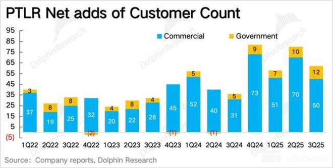 因此三季度运营指标所展露的 “增长放缓迹象”,很可能是市场最介意的地方。但海豚君认为,归根结底还是高估值的问题,实际上对于 Palantir 这种产品服务周期以年为单位、前期部署工作较重的定制化软件而言,季节间的波动是正常的。