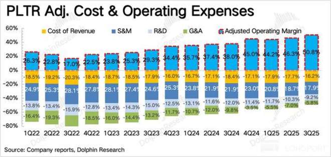 三季度 Palantir 实现 GAAP 下经营利润 3.93 亿,三项经营费用继续维持在 20% 左右的同比增长,低于收入增速,因此利润率提升。SBC 增幅不高,但相比收入占比继续下滑。考虑到同期市值上涨了 30%,因此可能在同步进行员工优化。