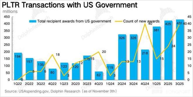 从官方预算明细来看,三季度 Palantir 与美国政府的签单量依旧饱满,其中包括一项与退伍军人事务部签署的价值 3.85 亿美金合同。