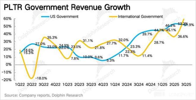 三季度政府客户收入同比增长 55%,增长主力依然是本地政府,但国际政府本季度明显加速,增速甚至超过了美国,体现今年以来的签单(北约、英国、德国等)逐步开始进入服务周期。