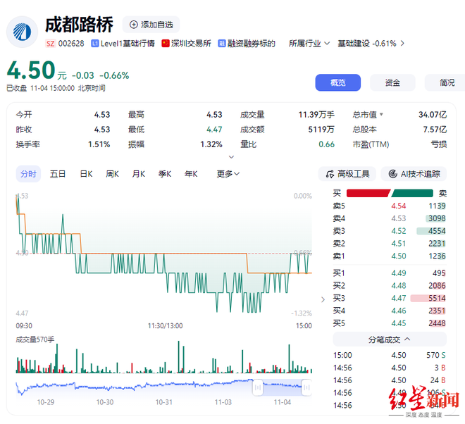二级市场方面,截至今日(11月4日)收盘,成都路桥报4.50元/股,跌0.66%,总市值为34.07亿元。