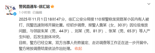 11月5日13时29分,@警民直通车-徐汇站发布警情通报:2025年11月1日18时47分,上海市公安局徐汇分局接110报警称龙吴路某小区内有人被打,民警迅速到场开展处置。经初步调查,报警人詹某(女,30岁)因垃圾堆放问题,与邻居朱某(男,44岁)、刘某(男,81岁)、张某(男,65岁)等人产生纠纷,后发生肢体冲突。