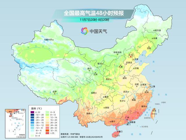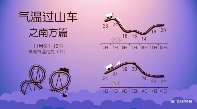 降雨未波及到的华南一带则仿佛回到了夏日状态。像是福州、广州等地明天(8日)前后最高气温接近30℃,与其他地区的气温差异极大。