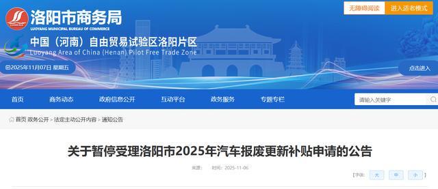 记者从洛阳、鹤壁两地商务局获悉,截至2025年11月6日13时54分,洛阳市2025年汽车报废更新补贴资金额度已使用完毕,此后首次提交的补贴申请将暂停受理;鹤壁市则自11月5日起,已先行暂停2025年汽车报废更新补贴活动。