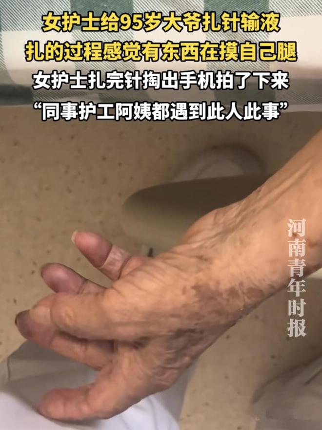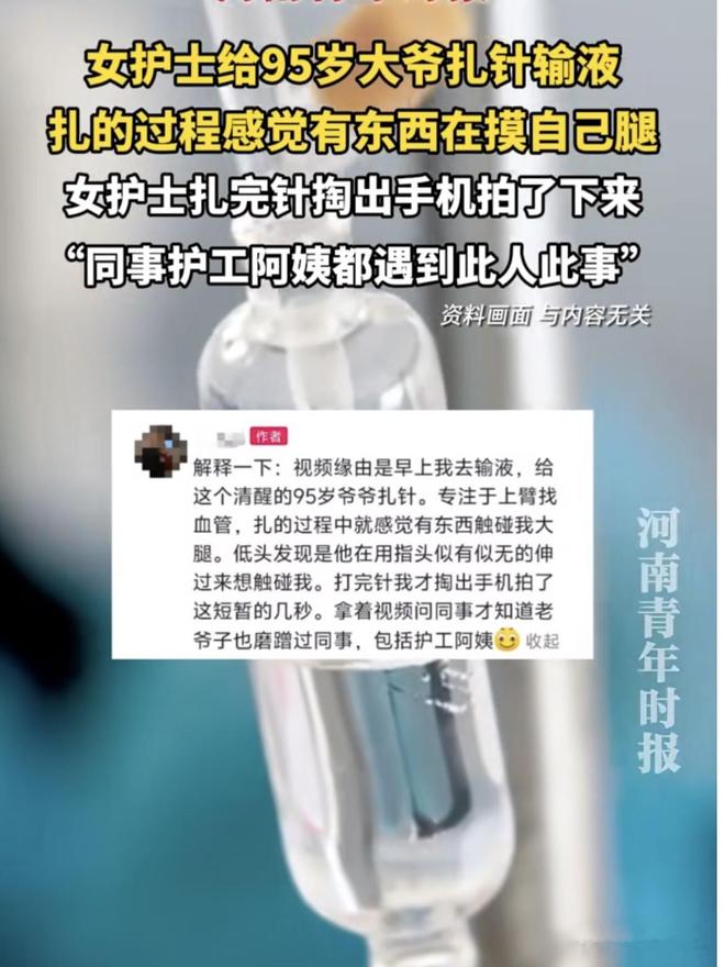 据11月5日的报道称,事件发生在江西一家医院的老年病房,二十出头的护士小丽负责照料这位95岁的男患者。老人因年迈瘫痪在床,虽神智清晰、能正常交流,但翻身、说话都十分费力,日常起居全靠护工和护士协助。那天交班后,小丽像往常一样为老人打针挂水,可老人的血管因年龄增长变得脆弱难寻,她只好蹲下身子,专注地在老人手臂上反复查看、寻找合适的下针位置。十几分钟的专注操作后,针剂终于顺利注射,就在小丽准备起身整理用物时,却突然感觉到大腿上有异样的触碰——老人那布满老年斑、只能轻微活动的手,正紧紧贴着她的裤子,不停磨蹭着,猥亵动作明显。
