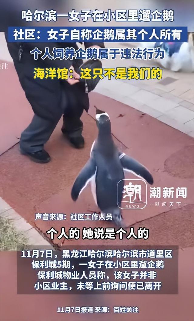 哈尔滨一女子在小区里遛企鹅?物业:并非业主;社区:女子称企鹅属其个人所有,是违法行为