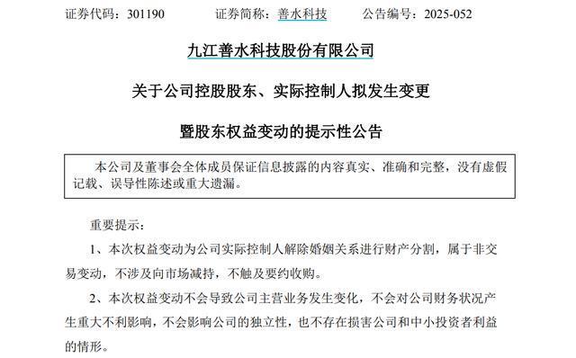 11月7日,善水科技发布公告称,公司实际控制人黄国荣和吴新艳解除婚姻关系,并进行财产分割。