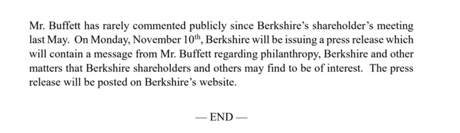 红星资本局11月9日消息,沃伦·巴菲特旗下公司伯克希尔-哈撒韦周五发布公告称:自5月伯克希尔股东大会以来,巴菲特先生很少公开发表意见。11月10日,伯克希尔公司将发布一份新闻稿,其中将包含巴菲特先生关于慈善事业、伯克希尔公司以及其他可能引起股东和公众兴趣的事项的致辞。