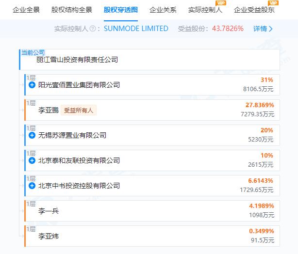 公开资料显示,雪山公司为丽江雪山艺术小镇的项目公司,阳光壹佰置业集团通过直接和间接方式持有雪山公司51%的股份,是该项目的实际控股股东;李亚鹏为雪山公司第二大股东,持股比例约为27.84%;李亚鹏的亲属则持有不少于11%的股份。