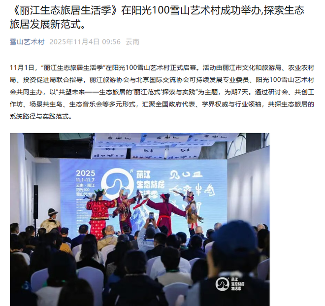 11月4日,认证主体为雪山艺术小镇的微信公众号“雪山艺术村”发文称:“丽江生态旅居生活季”在阳光100雪山艺术村于11月1日启幕。