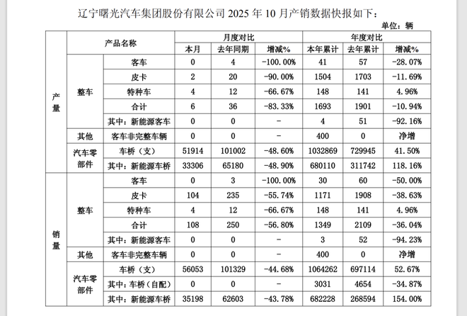 整车产量仅6辆,客车产销量均为0!老牌上市车企曙光股份10月产销量大跌
