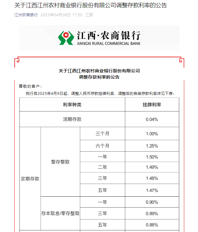 今年4月,江西江州农商行已先后两次调整了该行人民币存款挂牌利率。根据4月8日江西江州农商行发布的公告,自4月9日起,该行1年期、2年期、3年期、5年期定存挂牌利率分别降至1.50%、1.49%、1.48%、1.47%。其中,该行5年期存款利率较4月1日(上次调整日)下降38个基点。