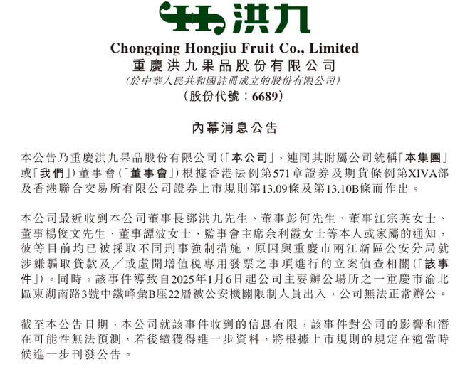 红星资本局4月16日消息,今日,重庆洪九果品股份有限公司(以下简称“洪九果品,06689.HK)发布公告,公司董事长邓洪九,董事彭何、江宗英、杨俊文、谭波及监事会主席余利霞女士等,目前均已被采取不同刑事强制措施,原因与重庆市两江新区公安分局就涉嫌骗取贷款及/或虚开增值税专用发票之事项进行的立案侦查相关。