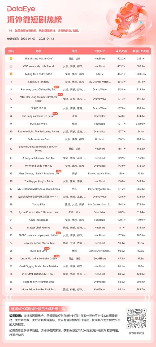 本期(4月7日-4月13日)DataEye海外短剧热榜,《The Missing Master Chef》登顶;《CEO Wants My Little Rascal》第二;《Falling for a SUPERSTAR》位列第三。