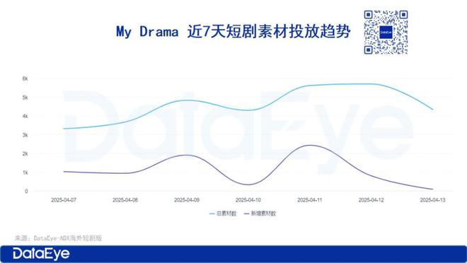 近7天,My Drama的日均素材投放量有大幅上涨,从3000+组升至接近6000组,于4月12日达最高值5693组。
