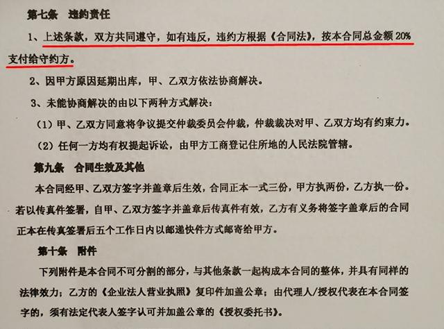 记者注意到,该合同在违约责任方面双方约定,如有违反,违约方按本合同总金额的20%支付给守约方。