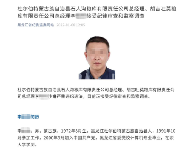 华商报大风新闻记者检索得知,同年1月8日,黑龙江省纪委监委网站发布消息称,“石人沟粮库”总经理李某涉嫌严重违纪违法,目前正接受纪律审查和监察调查。