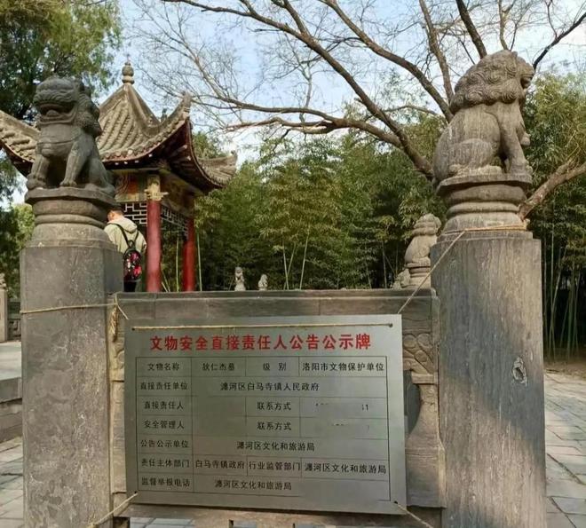 洛阳市白马寺内的“文物安全直接责任人公告公示牌”注明狄仁杰墓