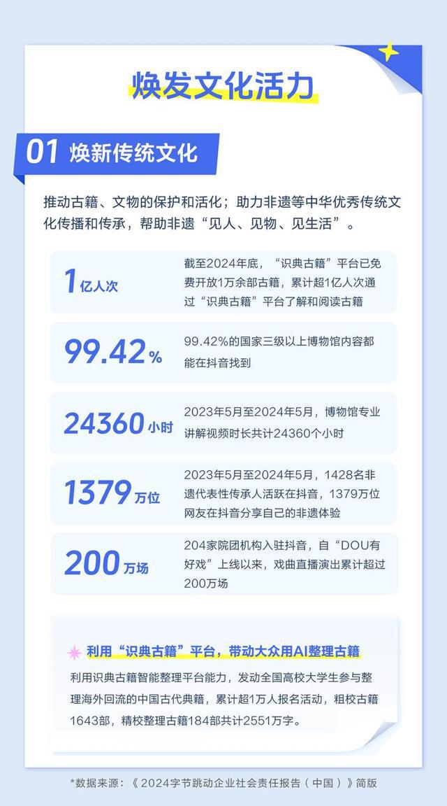 数字化技术让传统文化的推广和沉淀变得更加便捷。2022年,字节跳动与北京大学合作打造“识典古籍”平台,利用AI技术推动古籍数字化,并将平台资源向全社会免费开放。截至 2024 年底,“识典古籍”已免费开放 1 万余部古籍,服务超 1 亿人次。短视频和直播则为传统文化的挖掘和再创作提供了新工具和新思路。数据显示,2023年5月至2024年5月,1428名非遗代表性传承人活跃在抖音,1379万位网友在抖音分享自己的非遗体验。