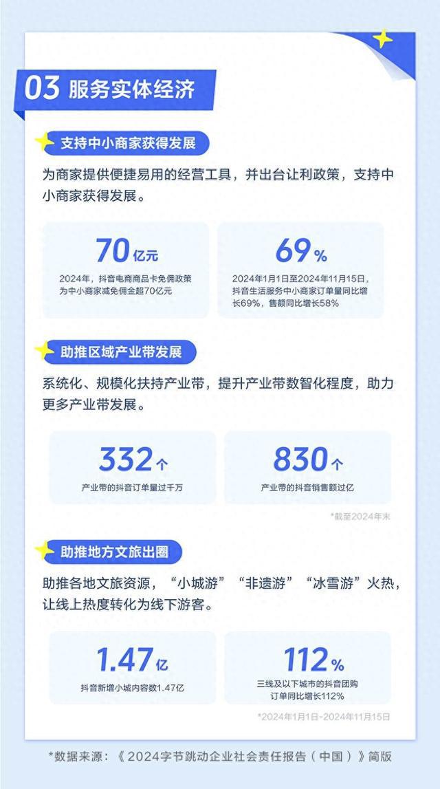 当下,网络直播正为经济增长注入新动能。时代浪潮下,字节跳动发挥平台能力,在创造商业价值的同时践行社会责任。在助力个人就业方面,抖音及相关生态催生了新的就业机会,为大众提供了更多元、灵活的就业选择。2024 年 7月,生活服务体验员(即探店达人)、网络主播等数字职业已被人力资源和社会保障部等部门共同增设为国家新工种、新职业。在促进乡村振兴方面,字节跳动通过电商、文旅等版块,让好产品和好风光出圈。数据显示,2023年9月至2024年9月,抖音电商累计销售农特产品71亿单;2024年全年,抖音“美好乡村等你来”乡村旅游数字提升行动带来游客2265万人次。在服务实体经济方面,字节跳动通过数字工具支持和让利政策,助力中小商家在抖音电商打开生意新局面。数据显示,过去一年,共有830个产业带在抖音销售额过亿。