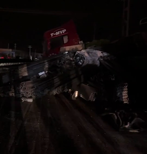 “国道上有1米高的钢板护栏,4月22日晚上10点左右,小车应是由东过来,半挂车是从北边过来,小车应该是跨道转弯,车速应该不慢,大车应该是为了避让小车,没躲开,相撞了。”