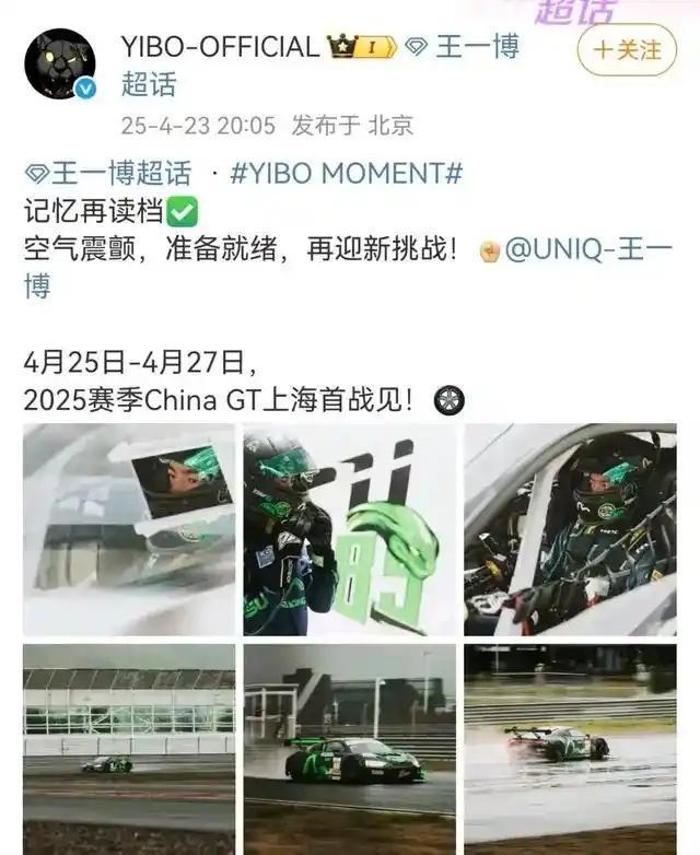4月23日,王一博工作室@YIBO-OFFICIAL 发文官宣,4月25日-4月27日,王一博将参加2025赛季China GT上海首战。