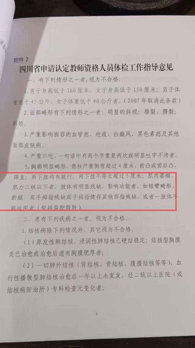 “她打电话问了四川省教育厅,省厅负责教师资格证的工作人员都已经给她解释过了,详细讲解了这方面的政策。按照四川现行的教师资格体检办法,确实是没办法。”