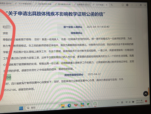 4月19日下午,雷女士通过四川教育发布网向四川省教育厅发送求助信。4月22日,她收到四川省教育厅教师发展中心的回复:“您的来信已交教师发展中心办理,具体办理进度可咨询教师发展中心。”