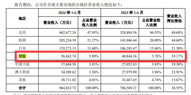 作为跨境电商领域的佼佼者,安克创新早在 2019 年便率先布局中东市场,凭借前瞻性战略眼光抢占先机。根据财报数据,2023年,该公司在中东地区实现营收9.08亿元,在总营收中占比 5.19%。与上一年的 7.62 亿元相比,同比增长了19.16%。到了2024年,安克创新仅用上半年时间,便在中东拿下了5.68亿元营收,相较于上一年同期的4.08亿元,同比增长幅度更是高达38.17%。