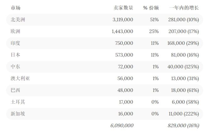Marketplace Pulse数据显示,目前亚马逊中东站拥有卖家7.2万,过去一年卖家新增数量高达4万,增长率125%,增长速度仅次于新加坡站(222%)。与此同时,亚马逊数据显示,截至2023年6月,已上线亚马逊中东站的中国卖家数量较上年同期增长超过了40%。