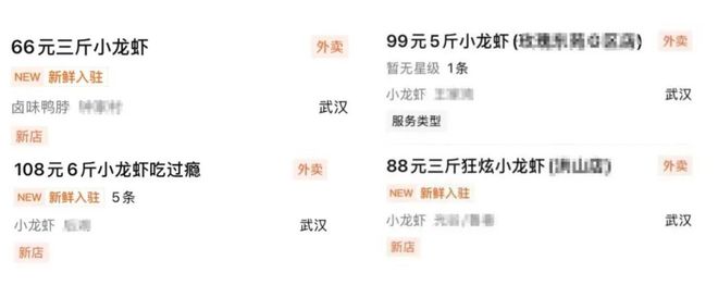 包括一些主做外卖的小龙虾门店,卖点也是低价。以小龙虾聚集地武汉为例,在大众点评上搜索“小龙虾”,会出现一大批门店,这些门店会直接将价格打在门店的门头、招牌上。