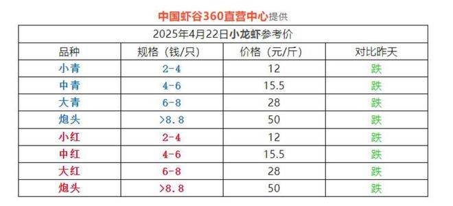 小龙虾垂直电商平台“虾谷360”,每天都会发布价格信息。其官微显示,4月22日,4-6钱/只的中青、中红的报价为15.5元/斤,6-8钱/只的大青、大红报价则为28元/斤,而且各个规格的小龙虾环比前一日均在下跌。而早前的4月2日,同等规格的小龙虾价格还为37元/斤、53元/斤。短短3周,小龙虾的价格近乎腰斩。