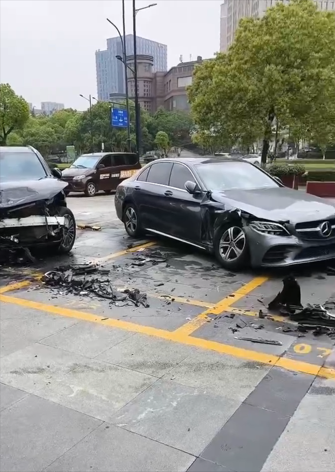 还有视频显示,受损车辆涉及2辆奔驰、1辆腾势、1辆宝马、1辆比亚迪、1辆雷克萨斯。其中,有4辆疑系遭撞击后,车辆位移产生挤压伤、擦伤等。至少2辆车受损严重。