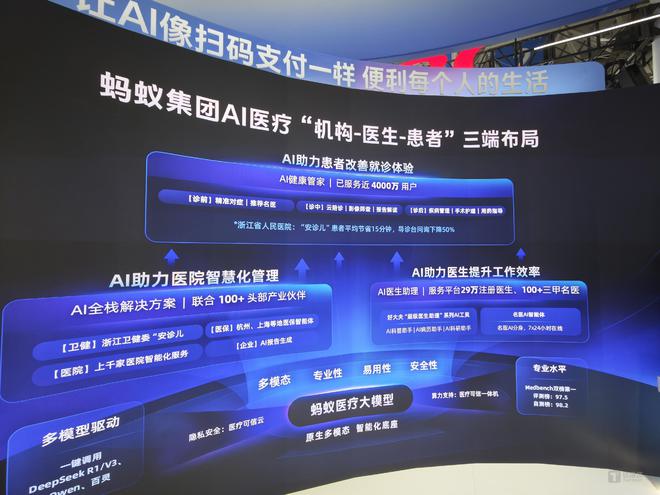 其中,AI医疗是今年蚂蚁集团的重点方向。今年1月,蚂蚁集团正式完成对好大夫在线的收购,并发布了面向医生科普和病历管理的“AI助理”;3月21日,蚂蚁集团宣布在医疗机构、医生、用户三端的AI体系升级,联合推出“蚂蚁医疗大模型一体机”,以及AI医疗全栈式解决方案;面向好大夫在线29万注册医生,发布AI医生助手系列工具,发起“百大AI名医”计划,将为全国百大名医打造AI分身;同时,服务用户的健康应用“AI健康管家”也推出智能思考、健康自测等十余项新功能。
