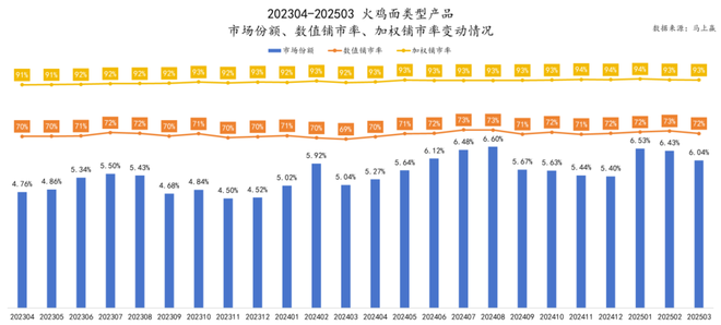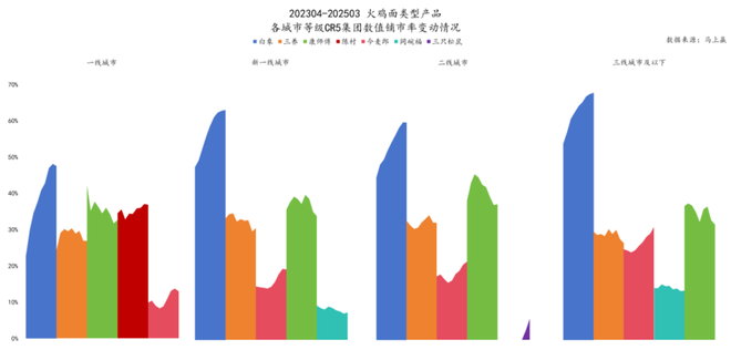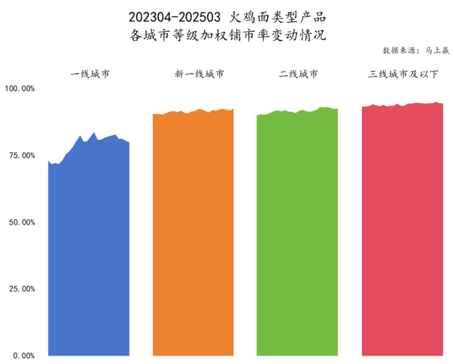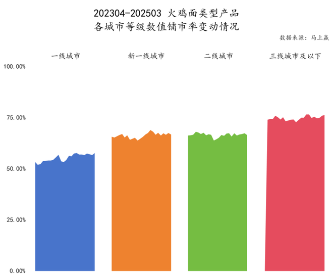 从 202304-202503,火鸡面类型产品的数值铺市率、加权铺市率来看,同样也呈现出下线城市铺市率较高、上线城市铺市率较低的特征。且一线城市的波动相对来说更大,三线城市及以下的铺市率则是稳步推进。